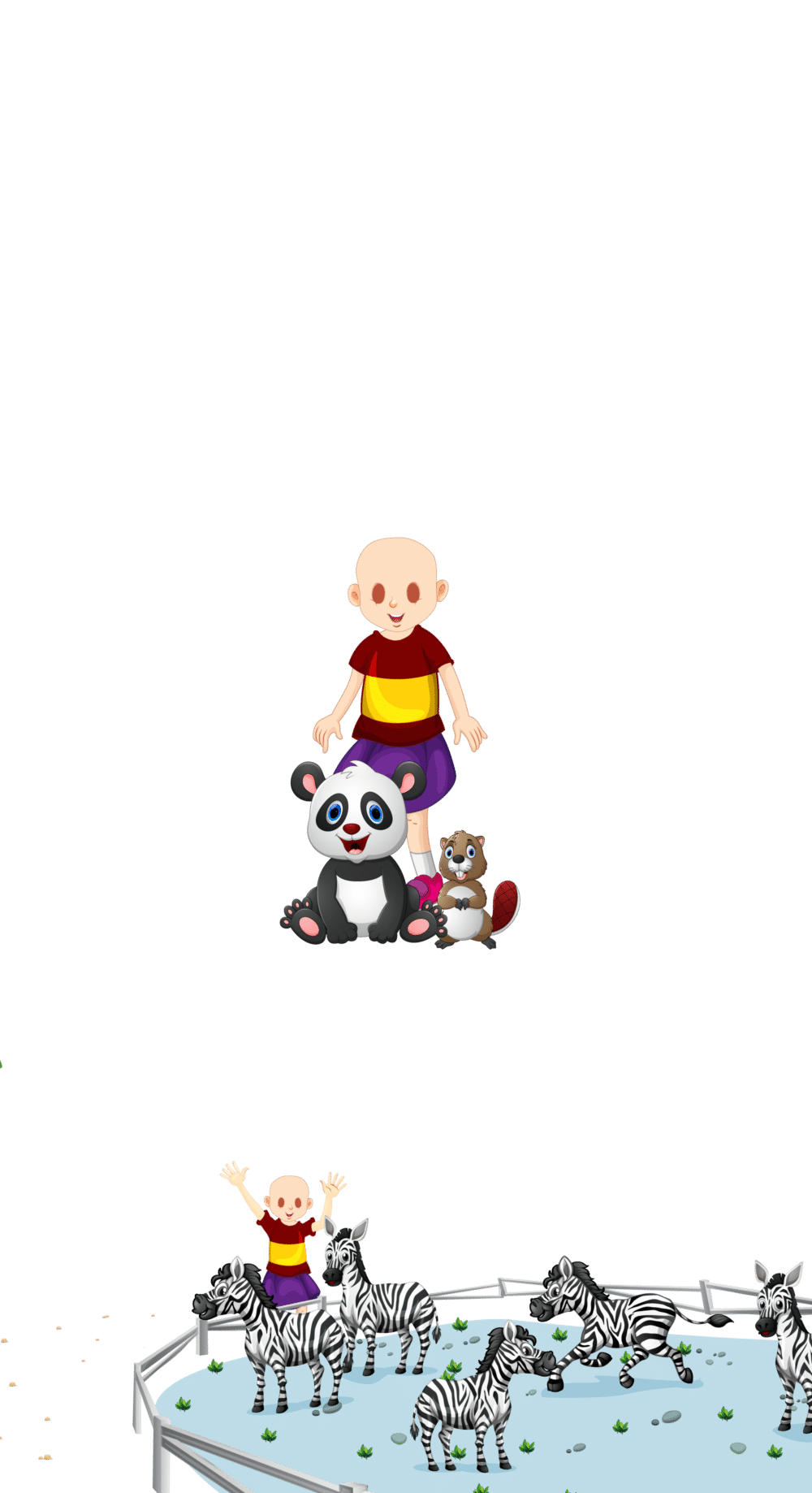 Hvad er forskellen på alligatorer og krokodiller? Er giraffer virkelig verdens højeste dyr? Hvorfor jager næsehorn ikke andre dyr? Fortællingen giver svar alle disse spørgsmål og flere til. Du kan sammen med dit barn opleve alverdens eksotiske dyr og lære en hel masse om, hvor dyrene oprindeligt lever og hvad de spiser. Barnet i fortællingen elsker zebraer, men mor og far bestemmer, at besøget starter i Abeland – mon de når hen til zebraerne, inden turen er slut?